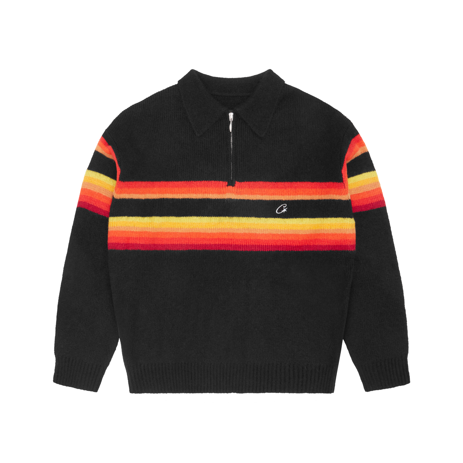 100% ACRYLIC KNIT ZIP UP. STRIPE PATTERN SLEEVES WITH FUZZY TEXTURE. RAGLAN SLEEVE CONSTRUCTION. CORTEIZ...