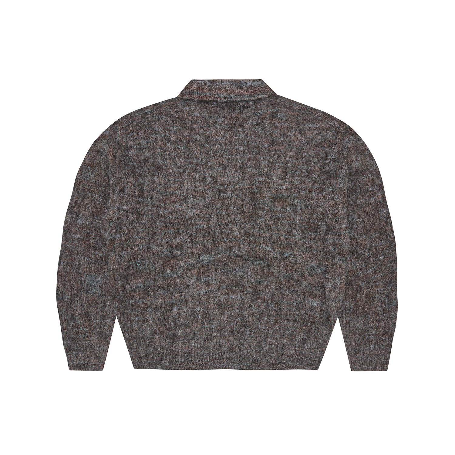 100% ACRYLIC KNIT ZIP UP. STRIPE PATTERN SLEEVES WITH FUZZY TEXTURE. RAGLAN SLEEVE CONSTRUCTION. CORTEIZ...